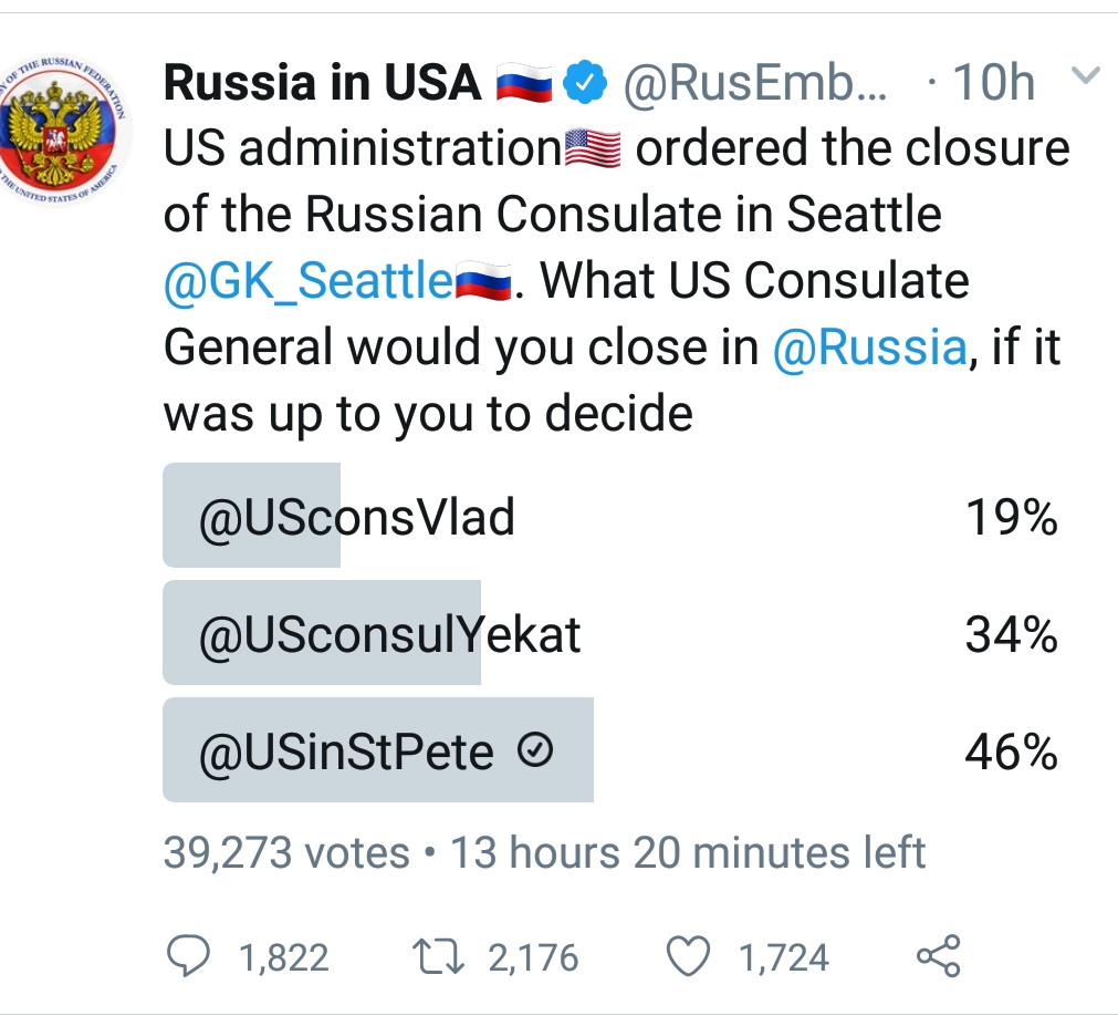 Jänkarna stängde ryssarnas konsulat i Seattle. Nu har ryska ambassaden i Washington omröstning på Twitter vilket amerikanskt konsulat man skall stänga som svar 😀 😀 😀