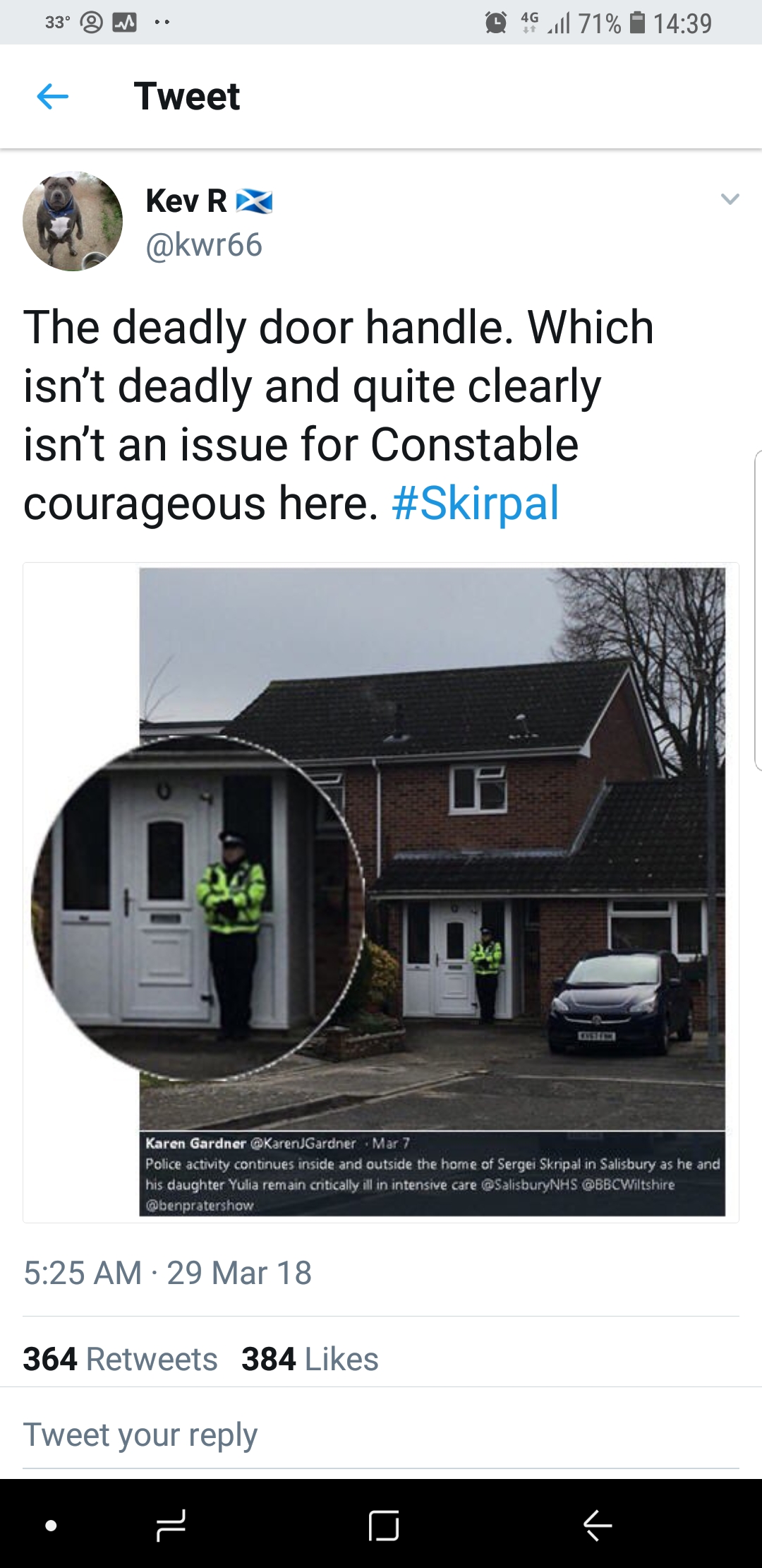 Polisen säger att högsta halten gift hittats på dörrhandtaget till Skripals bostad. De betraktar detta som den plats där Skripals exponerats för gift. Det förefaller orimligt att Skripals skulle ha varit opåverkade under 2.5 timme, sett ut att må bra på CCTV 10-15 minuter innan larmet och sedan insjuknat plötsligt.