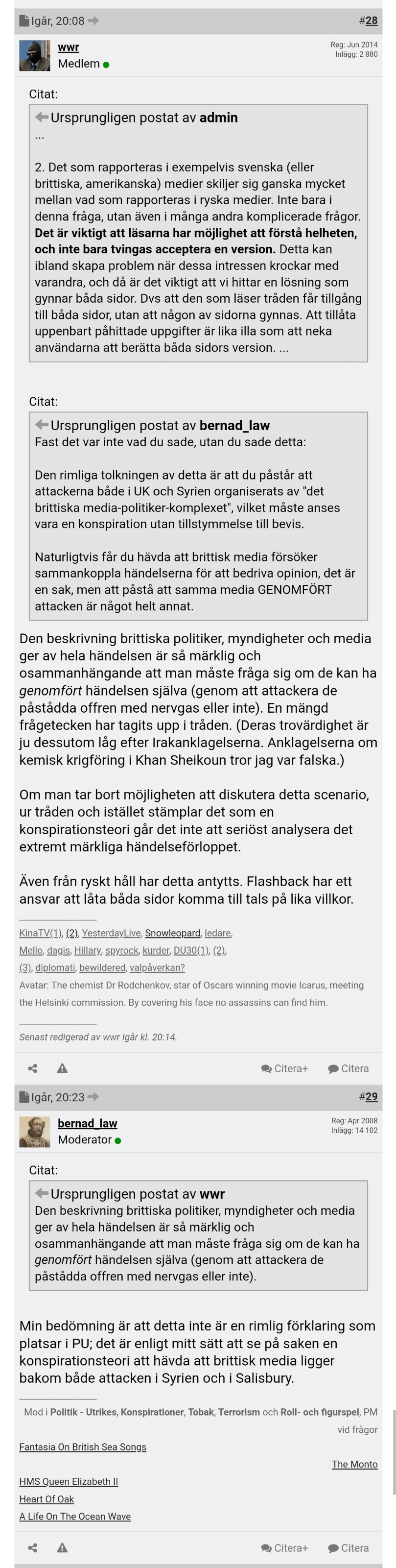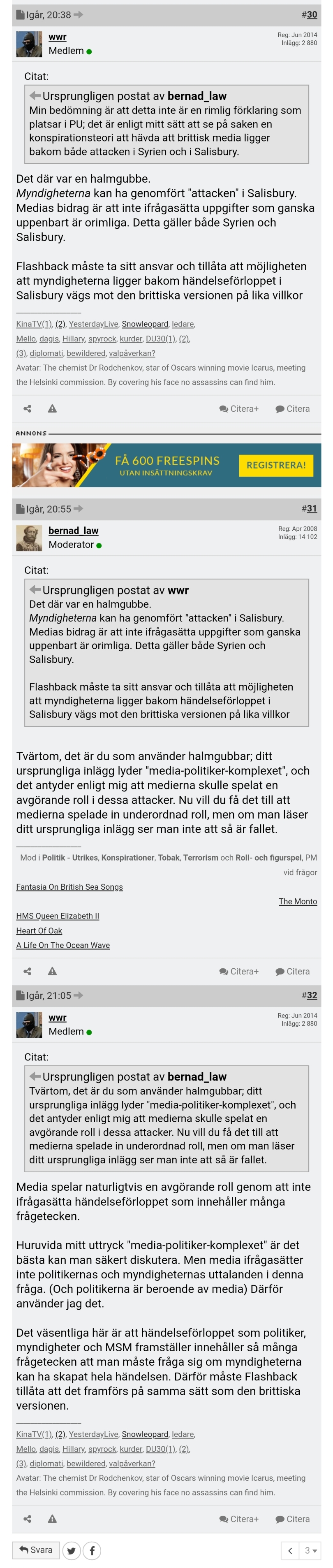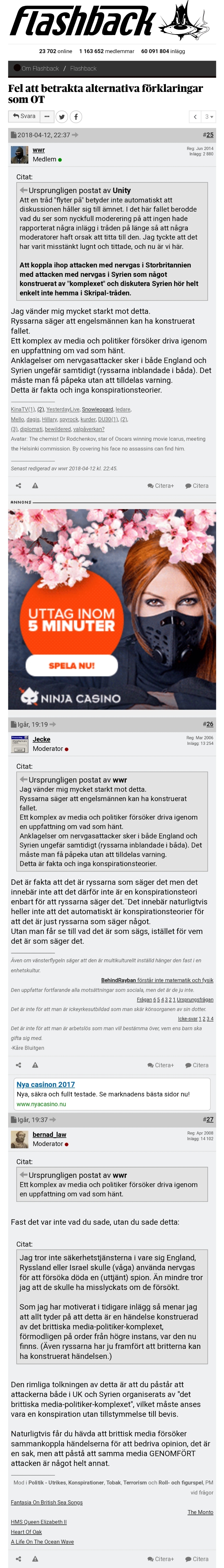 Flashback flyttar all diskussion som inte accepteratr MSMs version till ett eget forum för vad man kallar konspirationsteorier. Även den officiella ryska förklaringen förs dig. Då blir meningsfull diskussion omöjlig när man i huvudtråden för ämnet inte kan ställa den brittiska mot den ryska förklaringen. Man använder dessutom en tråd om “brottet” och en tråd om politiska konsekvenser. Med tre trådar om samma ämne försvinner kopplingar mellan det som sker och de politiska konsekvenserna.
