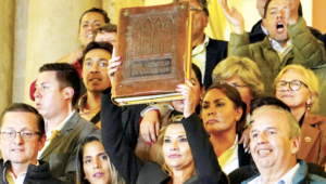 Next to her stood Luis Fernando Camacho, a member of the Christian far-right. After Evo’s resignation, Camacho stormed the presidential palace, a flag in one hand and a bible in the other. “The bible is returning to the government palace,” Camacho announced in front a camera while bowing before a bible and flag that he placed atop the presidential seal. “Pachamama will never return. Today Christ is returning to the Government Palace. Bolivia is for Christ.”