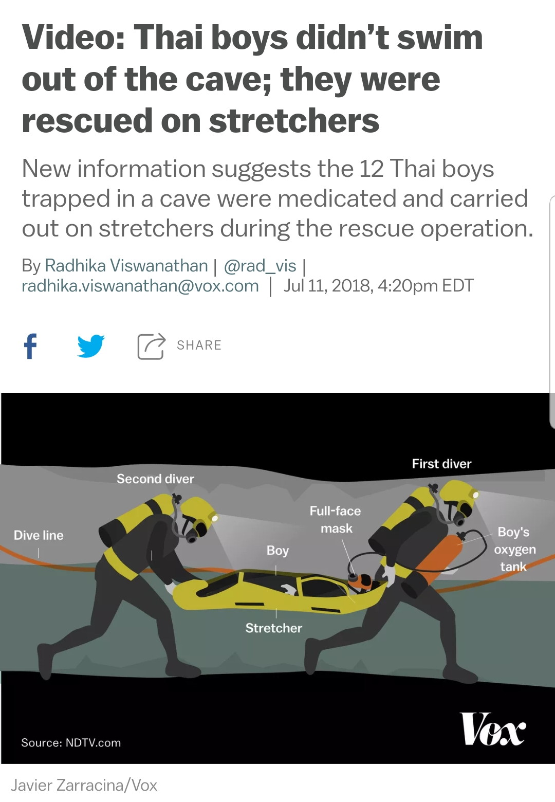 Up until Wednesday, Vox — and other news outlets — were reporting that the boys swam out of the cave, accompanied by professional divers. Over the weekend, rescue officials had been telling reporters that divers were teaching the boys to swim and to use diving equipment.